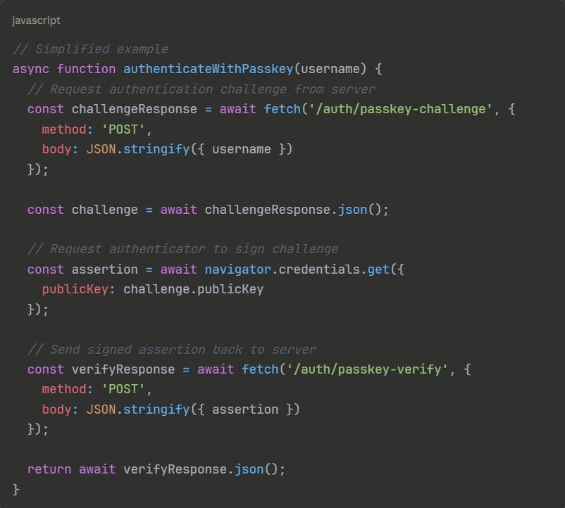 Implementing passkey support requires changes to authentication systems. Services must store public keys and credential metadata instead of password hashes. The authentication logic shifts from verifying password hashes to verifying cryptographic signatures.